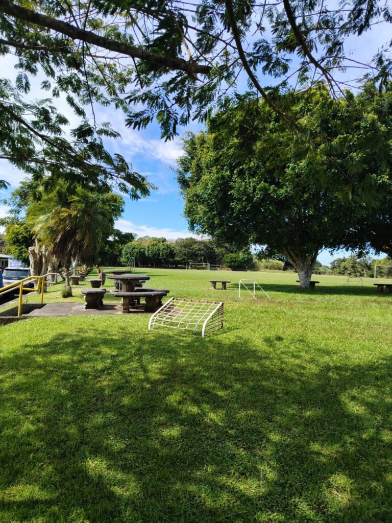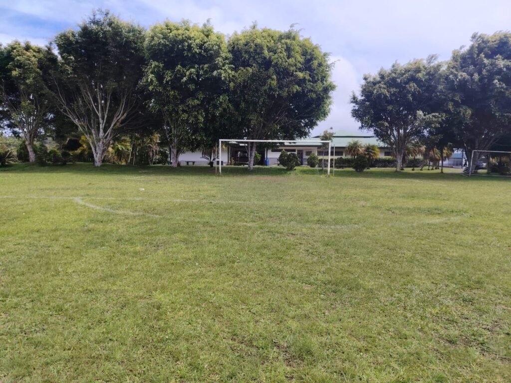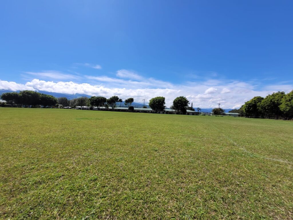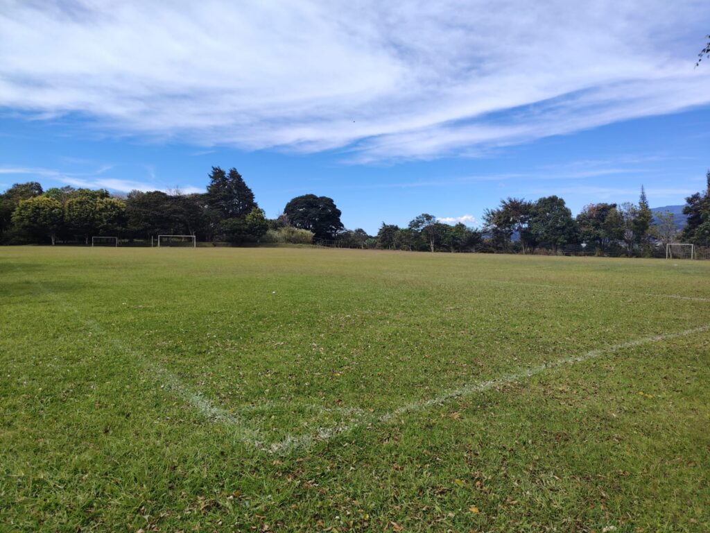 La cancha cuenta con dimensiones reglamentarias de 80 metros por 60 metros, lo que la convierte en un espacio adecuado para distintas dinámicas deportivas y formativas.